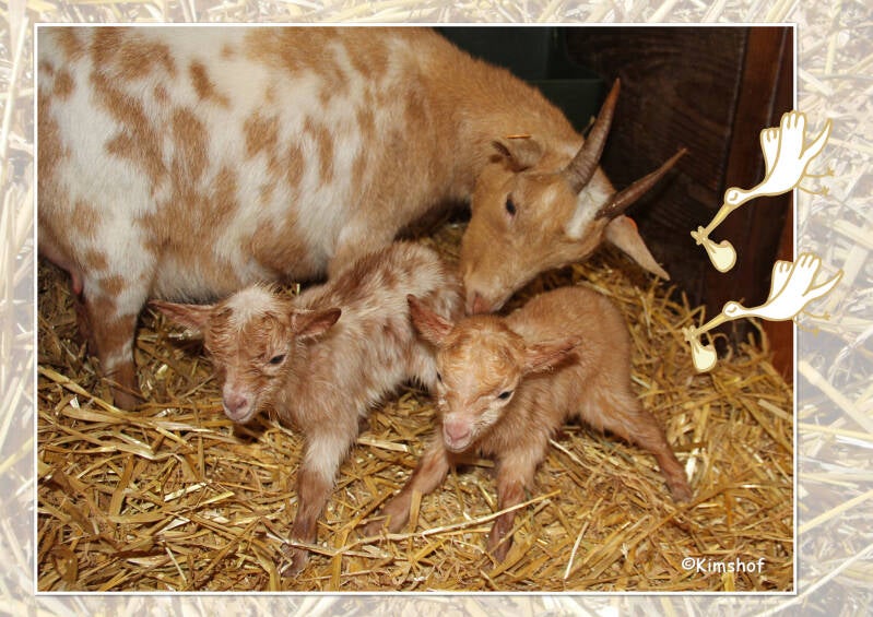 Het palominokleurige geitlammetje kreeg de toepasselijke naam Palomitty van 't Kimshof. Voor haar zus vonden we de naam Petitti Mitty van 't Kimshof wel leuk en mooi klinken.