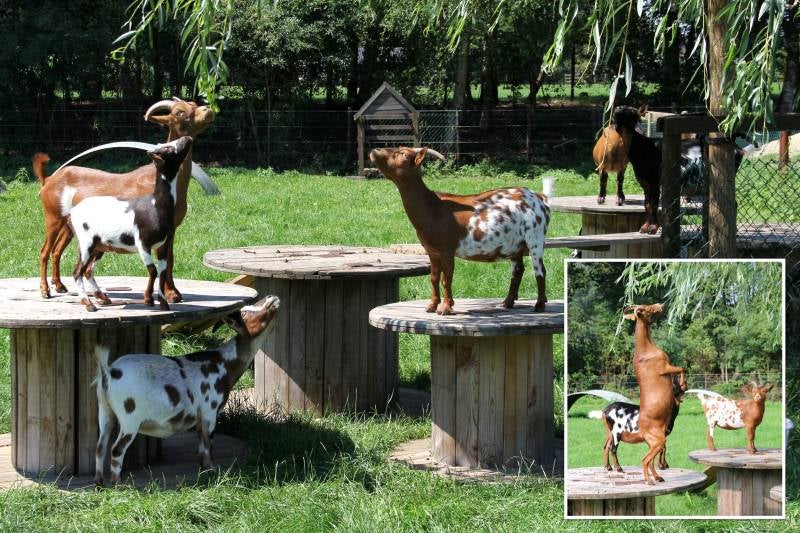 Verder proberen we altijd wat speeltuigen, haspels of boomstammen in de wei te hebben. Er werd ook een treurwilg in de weide geplant die door onze geitjes enorm wordt gewaardeerd.